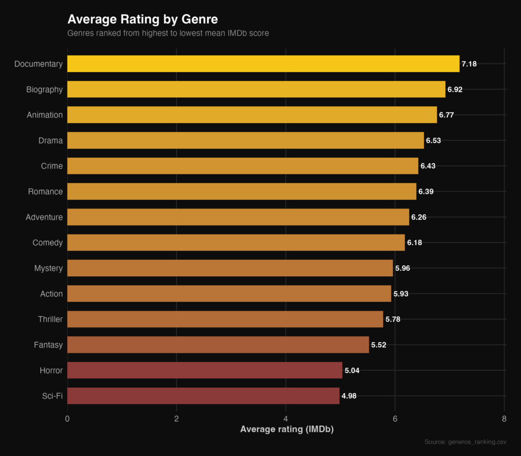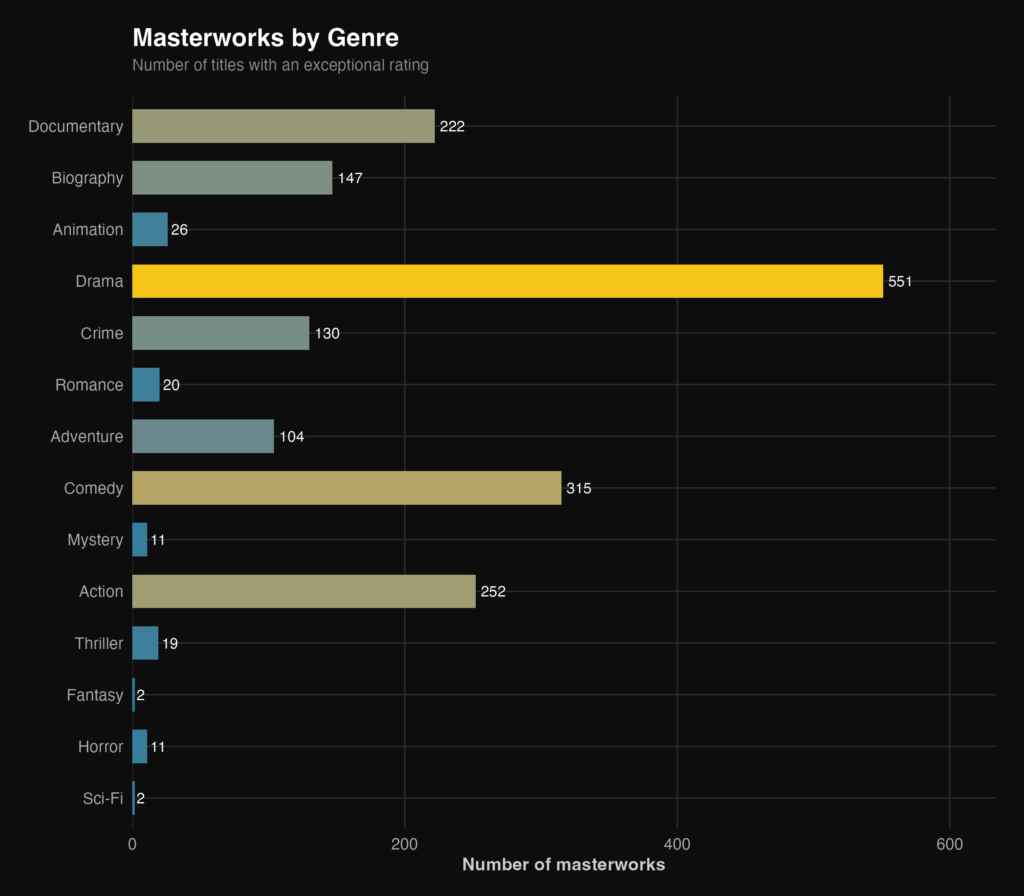 - The Rating Penalty: Horror has one of the lowest average rating on the chart (5.04). Does this mean they are “bad”? Not necessarily. It reflects a “cult” genre where the general public is often very harsh, yet loyal fans continue to consume it massively.
