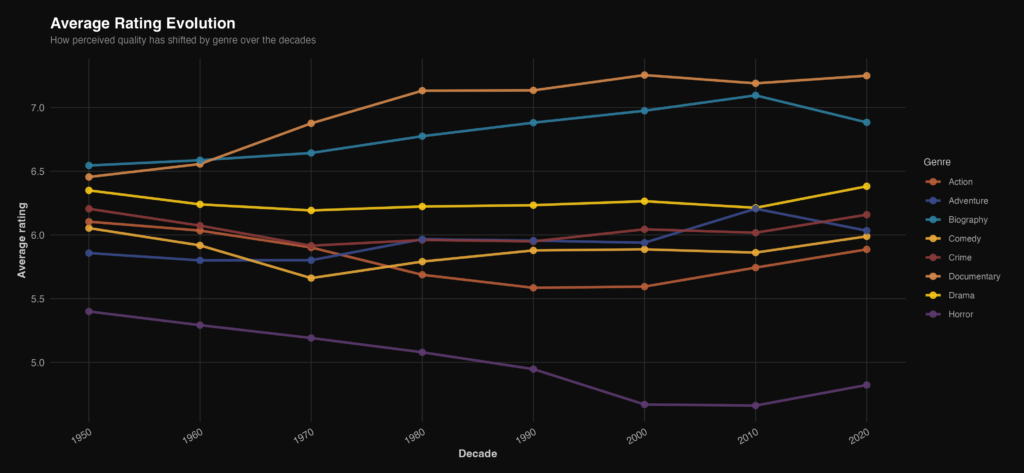 - Resilience Over Time: Unlike genres that fade out of fashion (such as the Western), Drama has grown every decade without losing its average rating—staying solid above 6.5 (Chart 4)—proving it is a “time-tested” genre.